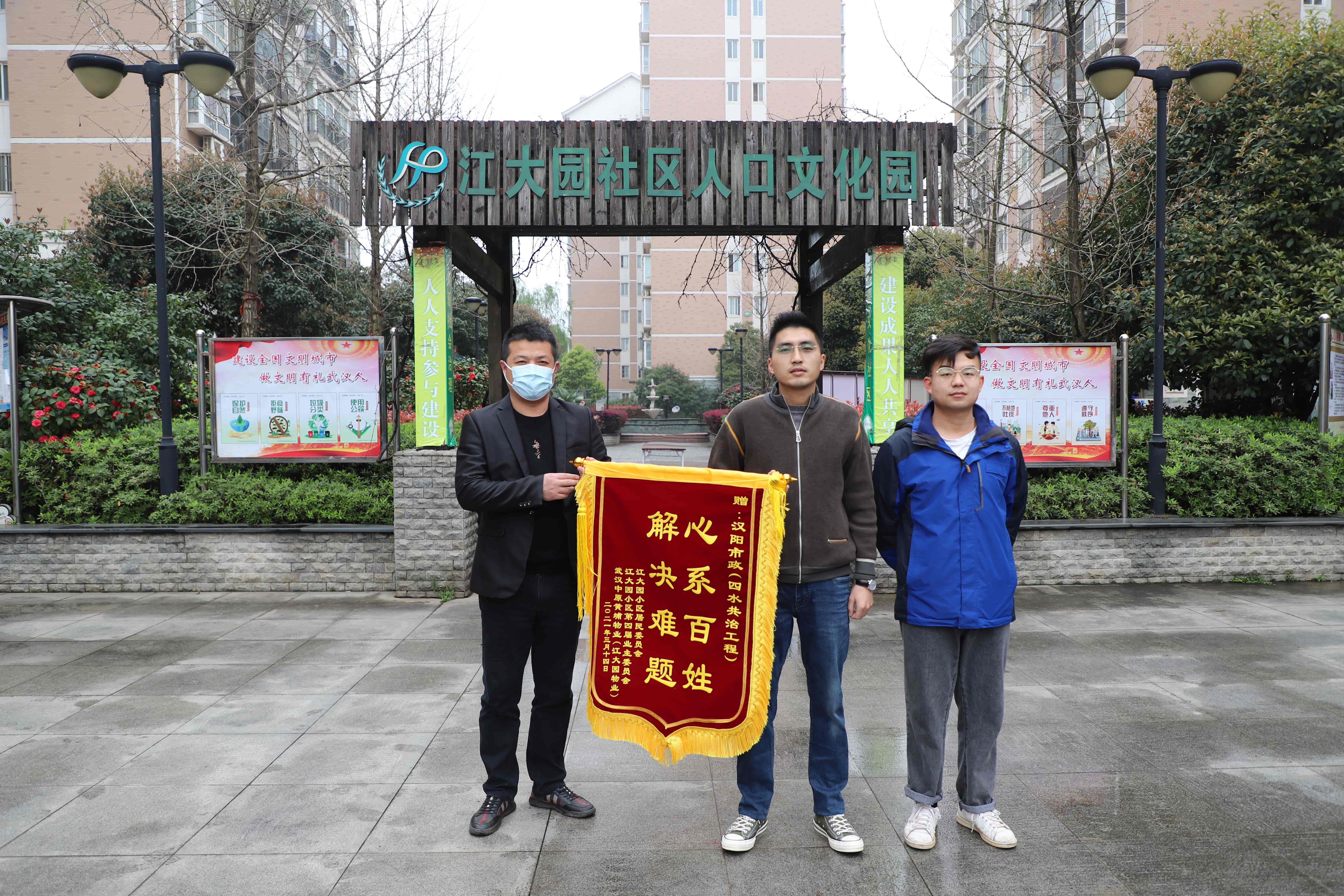3月18日上午,江大園社區(qū)物業(yè)工作人員為漢陽市政開發(fā)區(qū)(漢南區(qū))四水共治二期工程小區(qū)雨污分流改造(以下簡稱“雨污分流工程”)施工人員送來了錦旗,以此感謝他們解決了小區(qū)惡臭問題,撐起了小區(qū)居民的“幸福傘”。